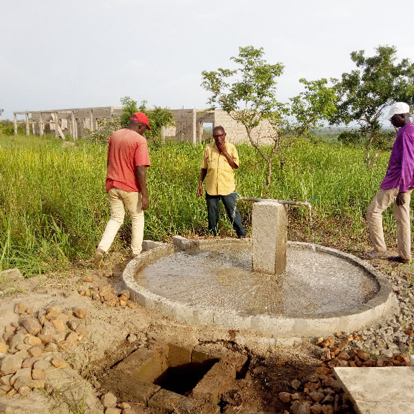 Ce forage équipé d’une margelle et d’une pompe manuelle, a permis entre 2018 et début 2020 la construction d’un château d’eau pour alimenter 2 fontaines, l’une pour l’école maternelle qui va bientôt ouvrir, l’autre pour le bâtiment des 3 premières classes du collège en cours d’achèvement.