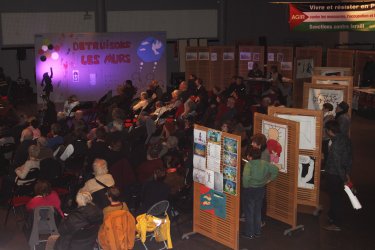 Le thème s’y prêtant, et reprenant la lecture critique effectuée par l’AFPS, le CICUP, l’UJFP et l’Institut de recherche de la FSU, une animation interactive a été proposée sur le traitement de la question israélo-palestinienne dans les manuels scolaires et productions parascolaires. Un quizz à remplir en début de séance et un diaporama ont permis au public de détecter les erreurs ou omissions dans les ouvrages à destination de la jeunesse.
